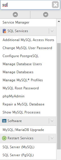 1. Login into WHM and in the left side navigation bar search for “SQL”.